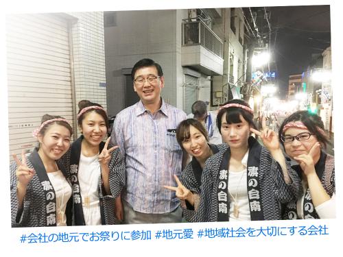 実はここ旗の台商店街は大井町まで繋がっていて、同日開催のお祭りで町会ごとにお神輿を担いでタスキを繋いでいるんですが、担ぎ手の高齢化もあって、「神輿の担ぎ手が足りない!」という情報を聞いたのです。これも何かの縁だと思って、旗岡八幡神社の例大祭に若手の社員と参加させて頂いたんです。